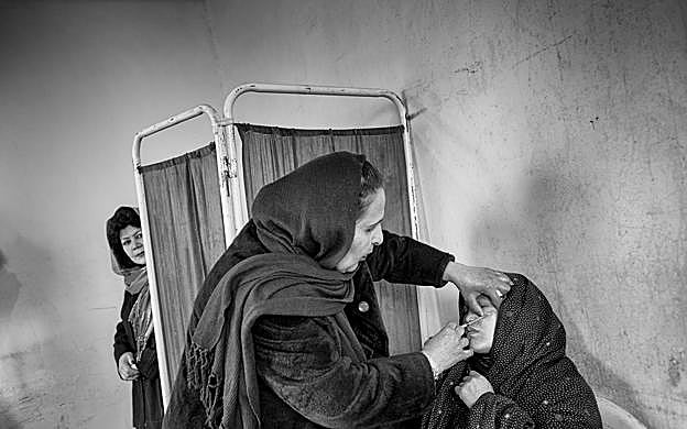 Un grupo de mujeres y niños espera para ser atendido en el Instituto de Malaria y Leishmaniasis, que recibe decenas de nuevos pacientes al día. Estas enfermedades se propagan a través de los mosquitos, que se reproducen fácilmente en las casas en ruinas de Kabul.