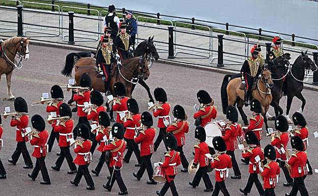 Este viernes será dedicado a la fe -aunque Buckingham avanzaba anoche que la reina no asistirá a los oficios en St. Paul por encontrarse «indispuesta»-. Pero este jueves lo fue a las armas. Desfile y bandas militares, 82 cañonazos, aviones militares como remate del 'Trooping'. La reina en el balcón del Palacio de Buckingham junto a príncipes uniformados y otros familiares. Enrique y Meghan habrían visto la parada desde una casa en torno a la explanada.