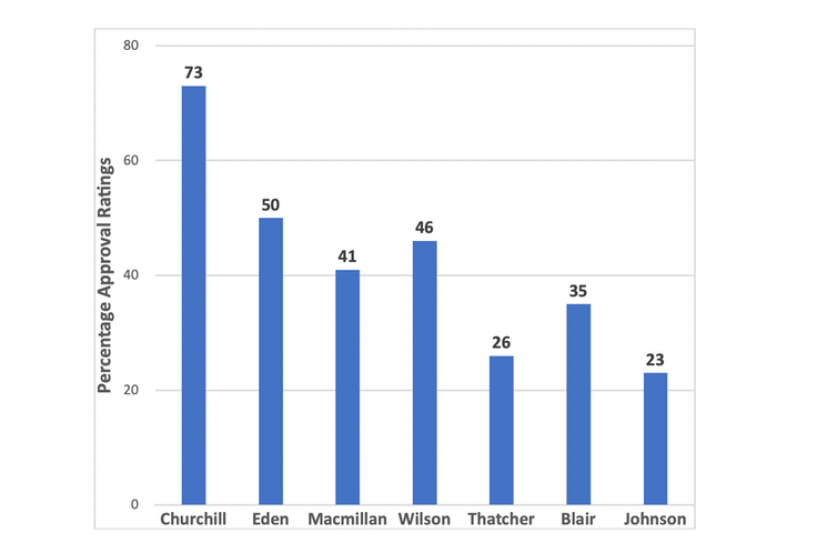 Muestra los índices de aprobación de estos seis primeros ministros en el mes en que dimitieron, más el índice de aprobación actual de Johnson. Está claro que Churchill era muy popular cuando dimitió en abril de 1955 –el suyo fue un caso genuino de enfermedad que provocó la jubilación–. Eden, Macmillan y Wilson tenían unos índices respetables y Blair era menos popular, aunque seguía teniendo un índice de aprobación del 35 %.