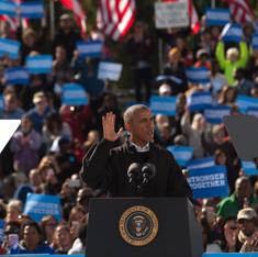 El presidente Barack Obama advirtió que "la democracia misma está en juego" en las elecciones generales del 8 de noviembre, un dardo lanzado a Donald Trump, quien lucha contra acusaciones de conducta sexual inapropiada.