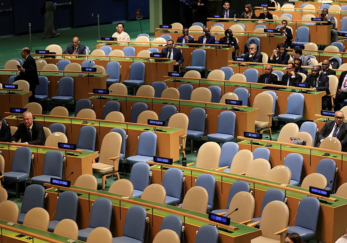 Aspecto de la sala donde se desarrolla la Asamblea General de la ONU en el momento de la intervención israelí. AFP