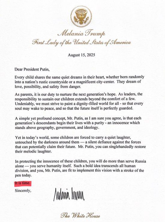 Melania Trump, esposa del presidente de EE UU y de origen esloveno, redactó una carta privada dirigida al presidente de Rusia, Vladímir Putin, en la ... que le insta a poner fin a los combates para proteger a los niños. En la misiva, que fue entregada en mano al líder ruso por Donald Trump durante la cumbre celebrada el viernes en Alaska, la primera dama le dice al jefe del Kremlin que «es hora» de actuar.
