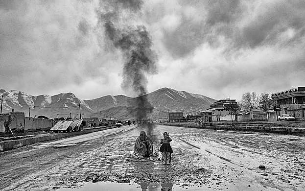 Una mujer con burka y una niña se sientan en medio de un camino embarrado frente a una hoguera. Tras la caída de los tabilanes, más de 3,5 millones de refugiados afganos regresaron desde Irán y Pakistán. Hoy buscan el modo de salir del país.