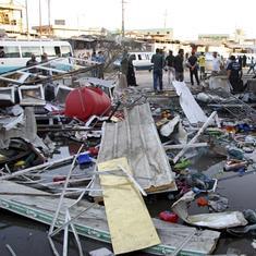 Varias personas observan los daños causados al explotar un coche bomba en Bagdad (Irak)