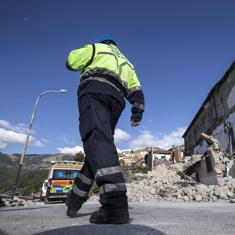 Un efectivo de los servicios de emergencia pasa ante los escombros de un edificio derrumbado en Accumoli.