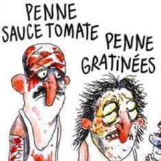 En la viñeta del semanario satírico se puede leer la frase 'Terremoto a la italiana: penne con salsa de tomate, penne gratinados y lasaña'