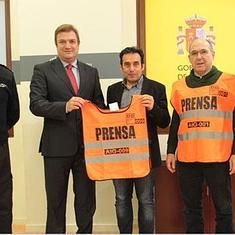 Miembros de la Asociación, encabezados por su presidente, Fernando Díaz, han presentado este miércoles los chalecos al delegado del Gobierno en La Rioja, Alberto Bretón, en presencia de los portavoces de prensa de la Policía Nacional en la comunidad, Alfredo Martínez, y de la Guardia Civil en la región, Miguel Angel Sáez.