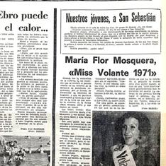 María Flor Mosquera: así se llamaba la feliz joven que en 1971 alcanzó la gracia de ser coronada como Miss Volante, ahí es nada. Semejante honor recayó sobre su testa con motivo de la celebración de San Cristóbal, patrón del ramo de la conducción. El Centro de Protección de Chóferes festejaba así al sector del transporte por carretera, celebración que volverá cualquier día de estos a asomar por las calles de Logroño pero, claro, sin verbena de proclamación de misses como era costumbre antaño. Los tiempos adelantan que son una barbaridad.