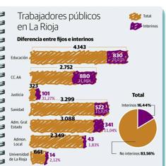 Por sectores, según la CSIF, la mayor interinidad se centra en los trabajadores de la Comunidad Autónoma (excluidos los de Justicia, Sanidad y Educación). Los datos de la CSIF apuntan que el 31,98% de los empleados son interinos (880 de 2.752). Por detrás está Justicia, con un porcentaje de interinidad del 31,27% (101 de los 323 empleados) y Educación, que con 830 interinos entre sus 4.143 trabajadores tienen una tasa del 20%. Así, en La Rioja el 16,4% de los empleados públicos (incluidos los de la Administración del Estado, las administraciones locales y la Universidad de La Rioja) serían interinos y en un hipotético despido podrían tener derecho a la indemnización que le correspondería a un empleado indefinido despedido por causas objetivas (20 días por año de servicio).