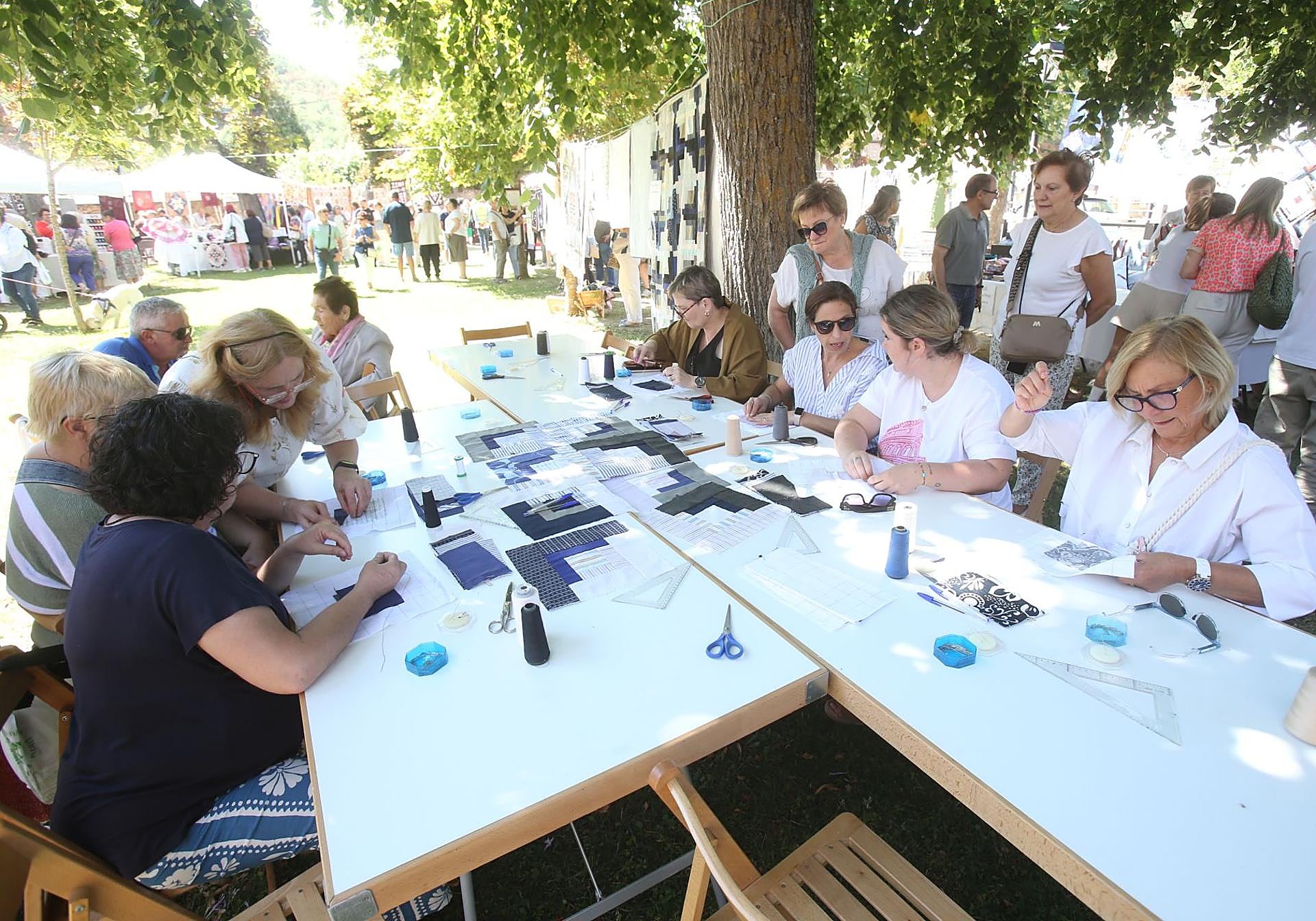 La localidad se engalana con la exhibición de almazuelas tendidas en balcones y ventanas, lo que le otorga colorido y vida porque son cientos los visitantes que acuden a contemplar lo que, en origen, fue una confección de necesidad y ahora son piezas artísticas. Una treintena de artesanas de diversas provincias han acudido para mostrar sus creaciones y entre ellas hay un solo hombre, el cántabro Aitor Sarabia. «Como aquí, en Cantabria el trabajo textil está muy arraigado, pero nosotros tenemos más cerca el bordado. Desde pequeño yo siempre he cosido con mi abuela y mi madre, pero hacía mis propios diseños, lo que ha supuesto una lucha con la familia, que querían que hiciera lo tradicional y yo no, yo quería hacerlo más a mi estilo», reconoce Aitor Sarabia.