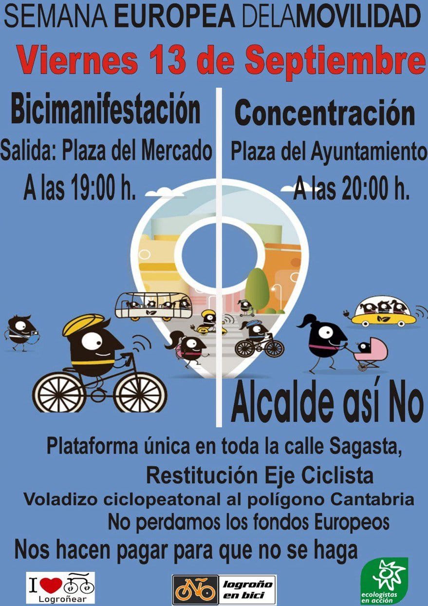 La Semana Europea de la Movilidad se celebra en Logroño con una bicimanifestación este viernes, 13 de septiembre bajo el lema 'Alcalde, así no. La concentración está programada para las 19:00 horas en la Plaza del Mercado, desde donde los participantes partirán hacia la Plaza del Ayuntamiento.