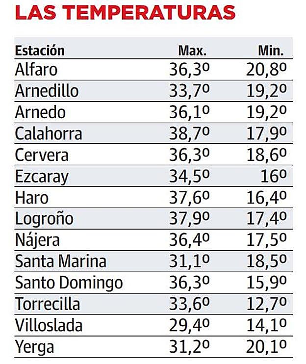 La Rioja superó ayer otra jornada sofocante. La alerta naranja, no obstante, no hizo lamentar incidencia alguna entre la población por golpes de calor, según confirmó el Gobierno regional. Pese a que las temperaturas alcanzaron los registros más altos de la primera ola de calor del verano, en ningún caso se llegó a los 40 grados que se habían pronosticado. De nuevo, Calahorra se apuntó la temperatura más alta, con 38,7 grados. El mercurio se disparó también en Logroño (37,9) y en Haro (37,6). A media tarde los cielos se cubrieron, lo que contribuyó a impedir una escalada de las temperaturas más extrema.