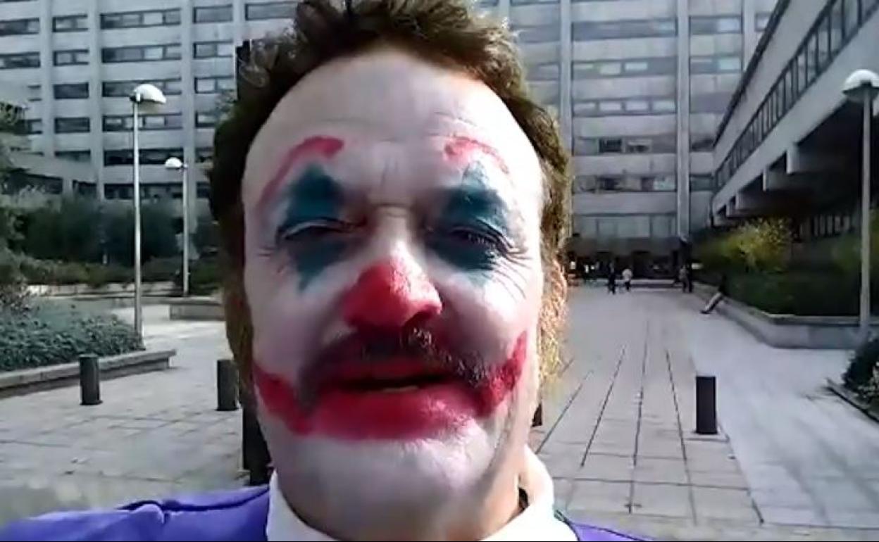 El actor riojano se ha acercado hasta el ministerio de Industria disfrazado de payaso para constinuar con la lucha que mantiene desde hace años, ya que su familia, como explica en el vídeo, se arruinó porque invirtió en energía solar.