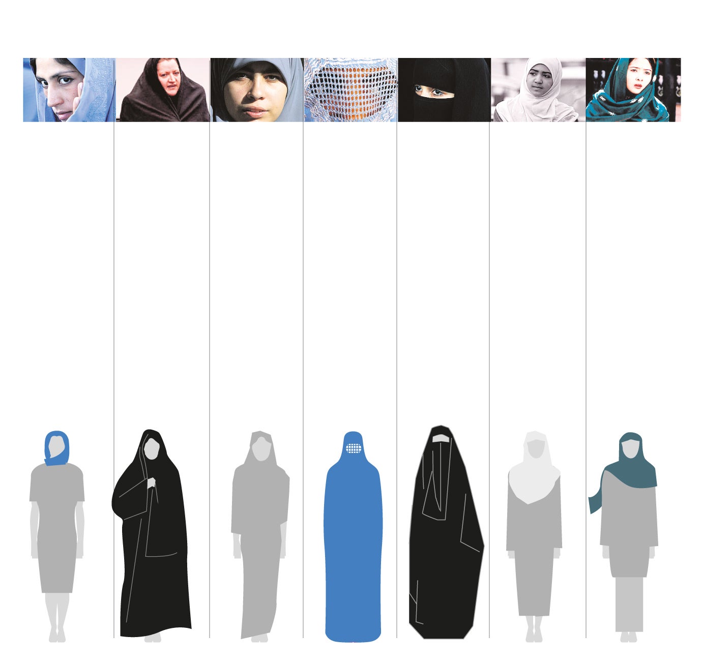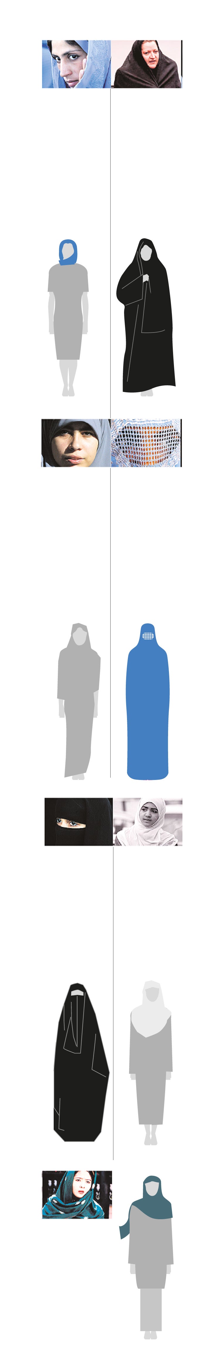 Tiene forma de capa que se extiende hasta la cintura, cubre el pelo, el cuello y los hombros pero deja el rostro al descubierto.