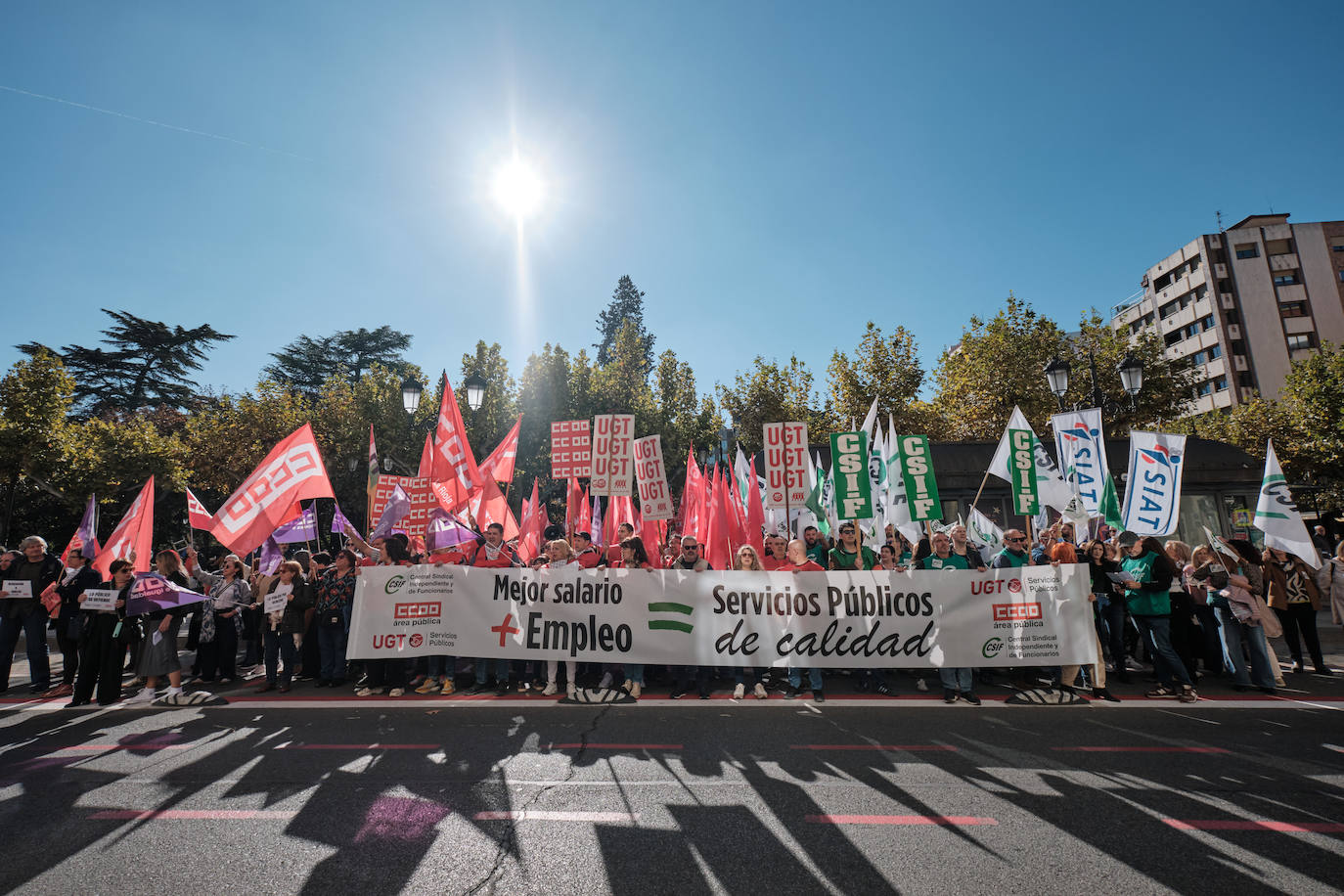 La concentración ha estado protagonizada por una gran pancarta con el lema 'Mejor salario más empleo, igual a servicios públicos de calidad', junto a banderas de los tres sindicatos convocantes; mientras que los participantes han coreado frases como «hace falta ya una huelga general» y «los funcionarios ya estamos aquí».