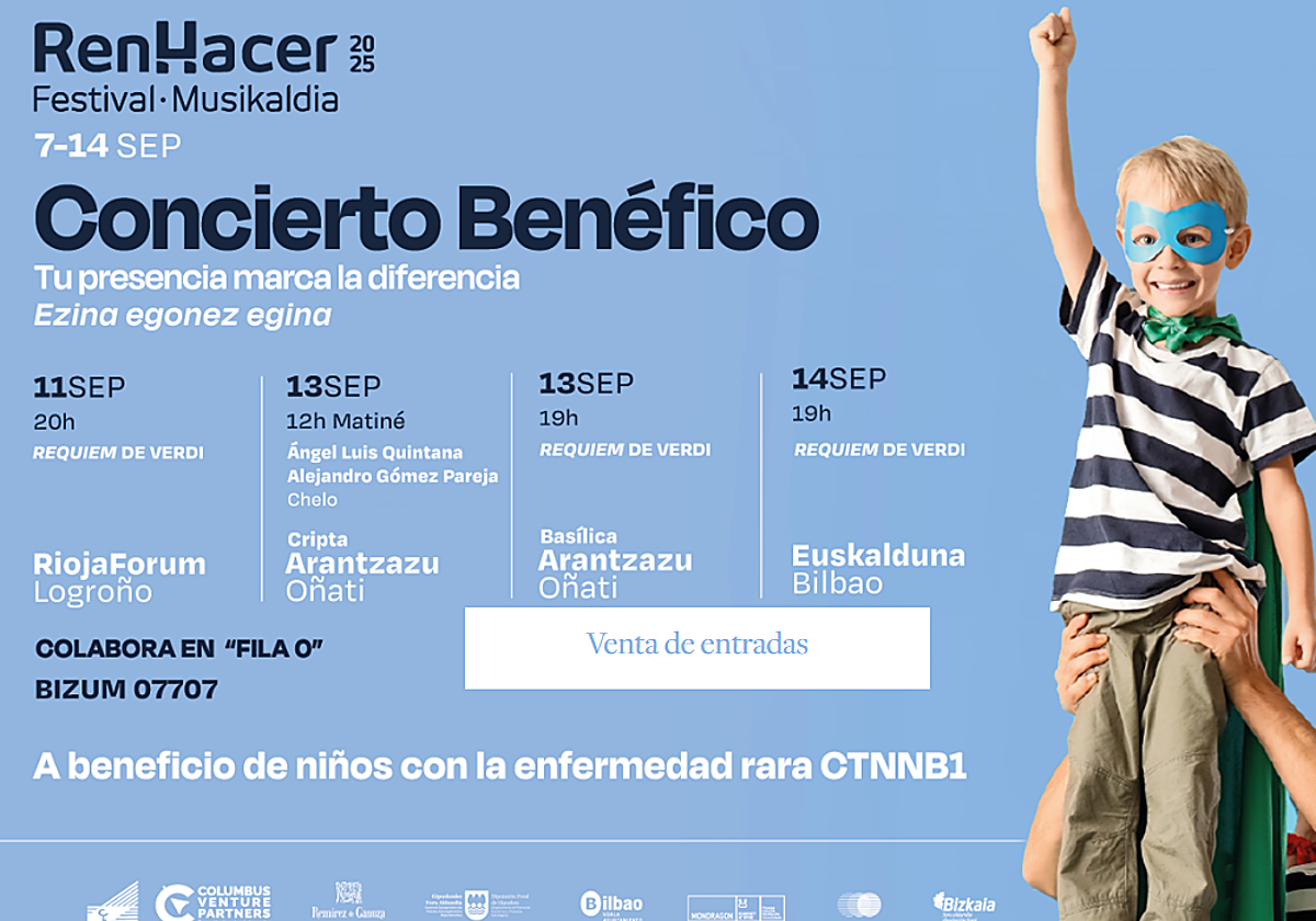 La consejera de Salud y Políticas Sociales, María Martín, ha presentado el evento junto al secretario de la Fundación Columbus, Javier García, y la presidenta de la Asociación CTNNB1 España, Estíbaliz Martín. El festival arrancará en Logroño el 11 de septiembre con un concierto del Orfeón Donostiarra y la Orquesta Sinfónica de Bilbao, que interpretará el Réquiem de Verdi en Riojaforum a las 20:00 horas.