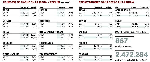 52 kilos por habitante en el año 2020. Es la cantidad de carne que el Ministerio de Agricultura atribuye a La Rioja en su ... informe anual de consumo alimentario. Son algo menos que hace cinco años (55 kilos en 2015) y algo más que lo que se come de media en España (49,86 kilos el año pasado).