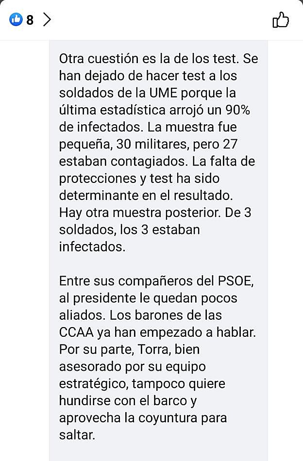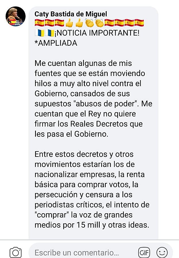 «Desgraciadamente en La Rioja ha habido muertos, demasiados. Se le olvida que en todas las comunidades ha habido muertos y bien que lo lamentamos como sociedad. Hoy en su Facebook se ha hecho eco de un mensaje intolerable y que salta todas las líneas rojas de lo que es democrático», ha dicho Ocón, quien apunta que la popular ha hecho «un llamamiento intolerable para cualquier demócrata» y la ha acusado de «autoproclamarse portavoz del Jefe de Estado»