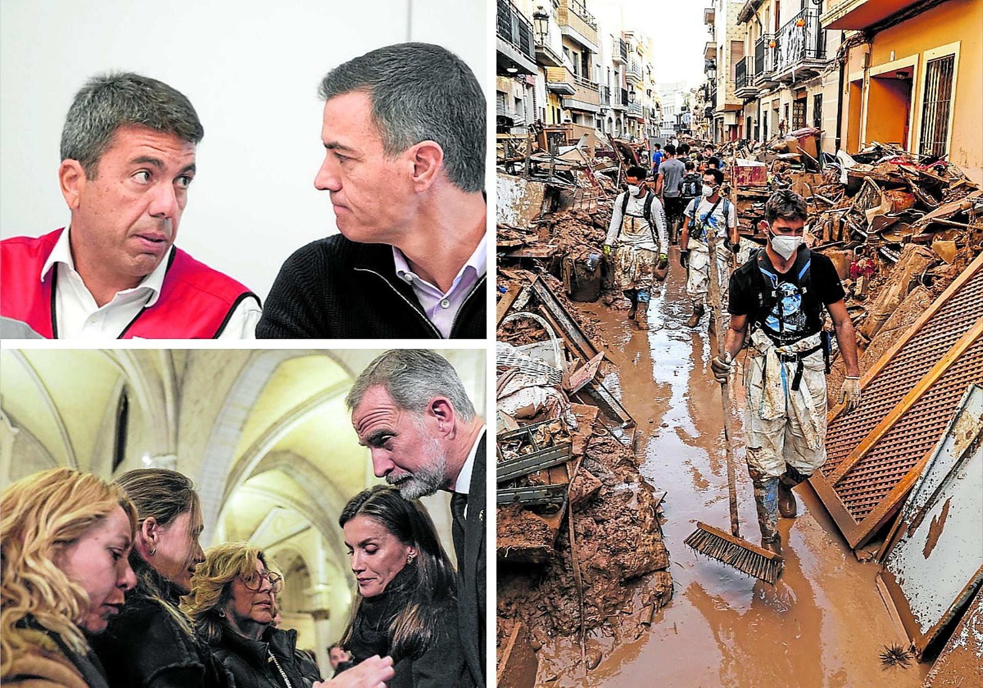 Tanta ayuda y colaboración fueron el contrapunto a un desastre que generó también una avalancha de indignación popular hacia los políticos por su gestión de la crisis. En primer lugar, hacia el presidente de la Generalitat Valenciana, Carlos Mazón. Pese a estar declarada desde la madrugada la alerta roja por la Aemet ante el riesgo de lluvias torrenciales, Mazón no cogió las riendas de la crisis hasta bien avanzada la tarde, cuando el agua hacía ya estragos en muchas localidades. El mandatario valenciano se encontraba comiendo en un restaurante con una periodista. La cita se prolongó y hasta las 19.30 horas no se incorporó al comité de crisis (Cecopi). La Generalitat envió el primer avisó general a todos los móviles de la población valenciana a las 20.11 horas. Para entonces, la riada tenía atrapados ya a muchos conductores y ciudadanos de la periferia sur de Valencia. No fueron las únicas críticas de un episodio que despertó también quejas hacia el Gobierno central por su tardanza en enviar efectivos de la UME y otros cuerpos de emergencias a las zonas afectadas. La rabia de los damnificados quedó también plasmada en impactantes imágenes de vecinos abucheando y tirando barro a Pedro Sánchez, Carlos Mazón y los Reyes durante su visita a la zona cero del desastre cuatro días después de la riada. Los ánimos estaban ya más apaciguados el 10 de diciembre, cuando la catedral de Valencia acogió un funeral por las víctimas con presencia también de los monarcas y representantes de todo el arco político.