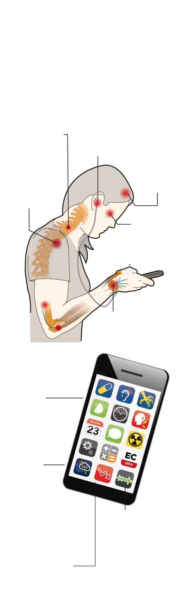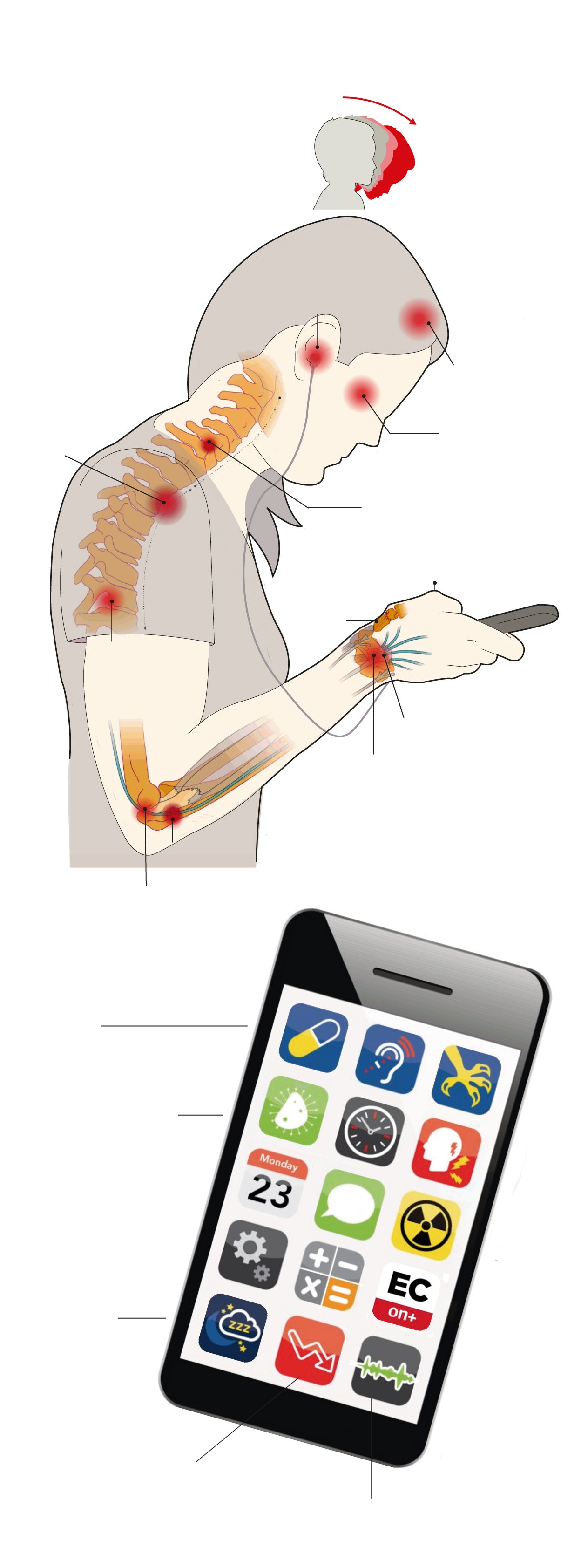 El uso del teléfono móvil entraña una larga lista de efectos nocivos en la salud, sobre todo si se emplea de forma masiva. En los niños, por ejemplo, puede provocar problemas musculares en su crecimiento y desarrollo. No solo eso, al utilizarlo se adopta una postura muy poco natural, porque se inclina la cabeza hacia delante sin reparar en el impacto que ejerce esta posición sobre el cuello. En este sentido, teclear o enviar mensajes durante un tiempo prolongado puede desencadenar en problemas de espalda, cuello y cabeza. Además, también puede provocar problemas de audición, desgaste cervical, fatiga ocular y un menor parpadeo (porque se secan los ojos ), debilidad muscular o dolores de cabeza. La lista continúa: un uso masivo también puede desencadenar en un entumecimiento de algunos dedos o en artrosis del dedo pulgar, en algunos casos.