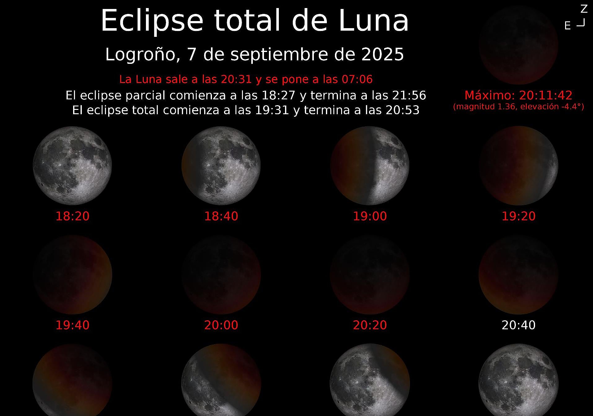 El cielo riojano se prepara para un espectáculo celestial este domingo 7 de septiembre. Si las nubes lo permiten, aunque las previsiones no dejan lugar al optimismo, seremos testigos de un eclipse total de luna, un fenómeno que transformará a nuestro satélite en la popular «luna de sangre».