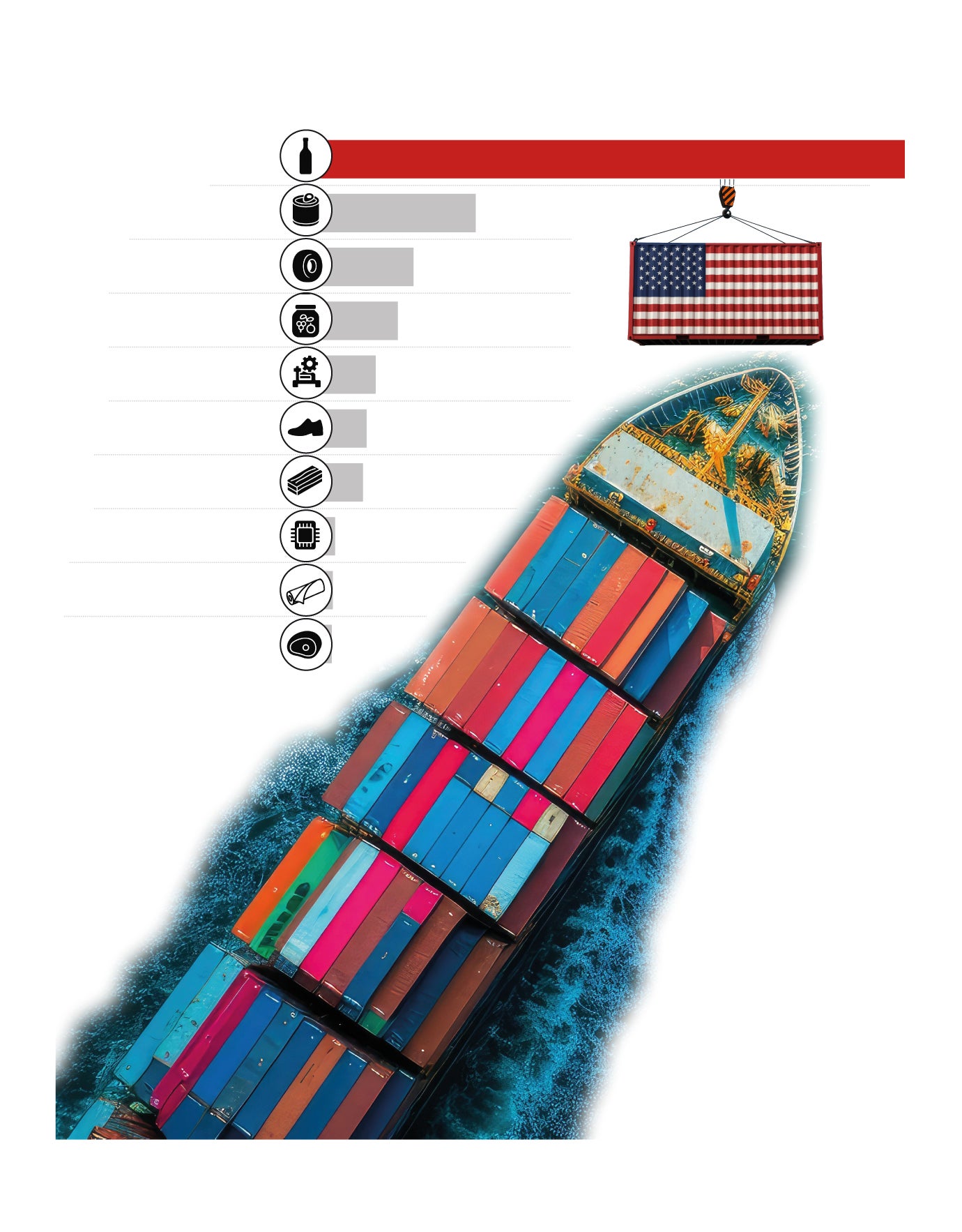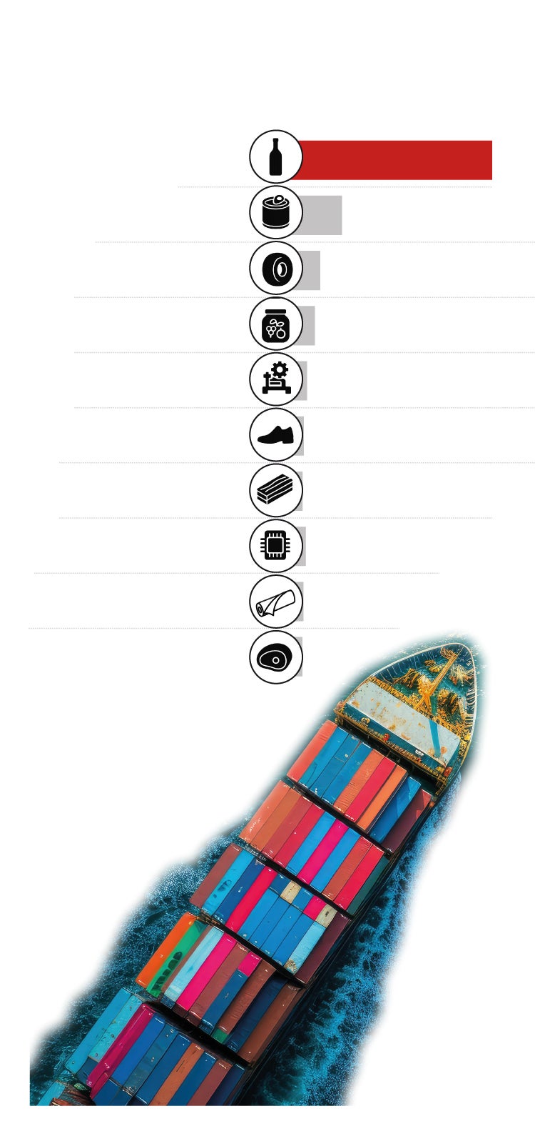 Aunque su peso en las exportaciones riojanas es abrumador, no solo el sector del vino padecerá los arreones proteccionistas del presidente Trump. Las bebidas suponen casi el 50% de las ventas riojanas a Estados Unidos, aunque también resulta relevante el volumen de conservas, tanto de carne o pescado (el 13%, más de 7 millones de euros) como de fruta o verdura (el 6,6%, unos 3,6 millones de euros). El calzado y la madera (muebles), si bien en menor medida, se verán asimismo afectadas. «Las empresas con exposición muy alta en los Estados Unidos no van a abandonar ese mercado –explica Argaiz–. No será la misma la estrategia para una bodega que vende el 5% en aquel país que para otra que distribuye allí el 50% de su producción».