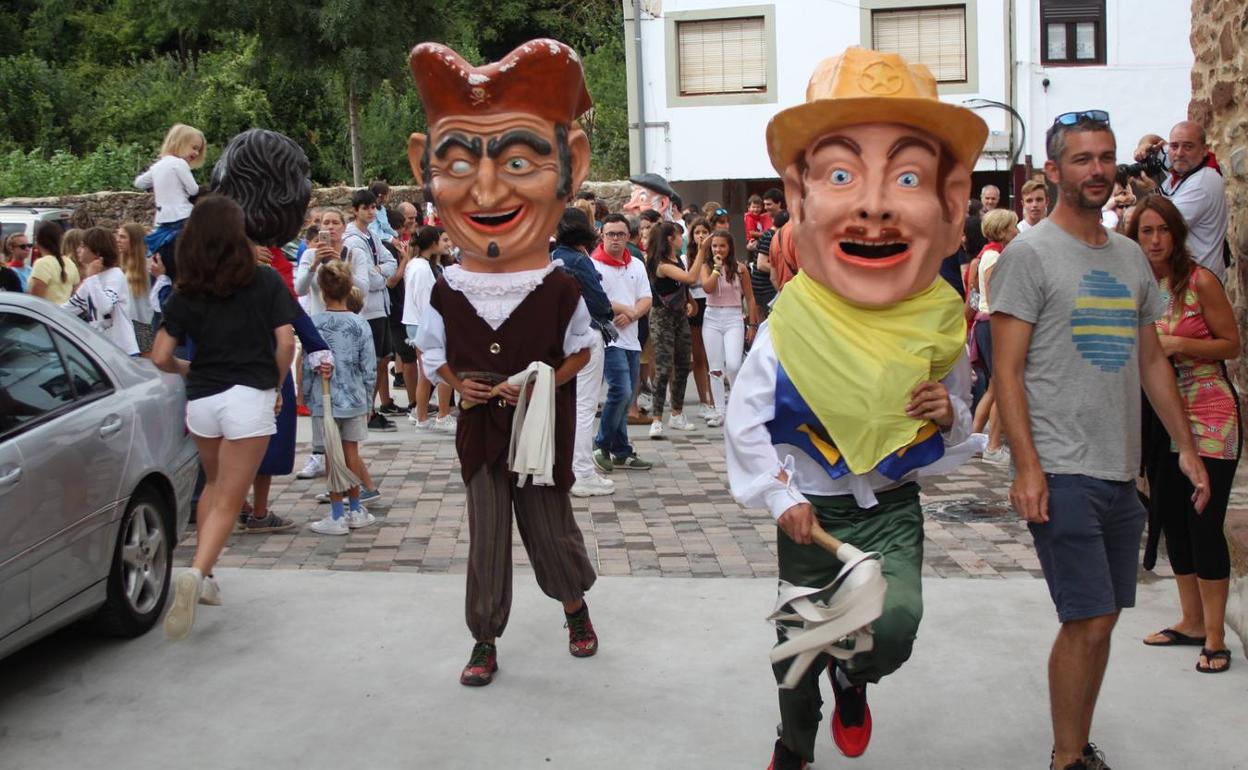 Pocos actos hay en las fiestas de los pueblos riojanos tan extravagantes como la comparsa de gigantes y cabezudos de Ezcaray. Una veintena de cabezudos y media docena de gigantes desfilan por las calles del pueblo acompañados de la charanga Los Pelaires y miles de vecinos y veraneantes que escapan de los azotes, piden fotos, ríen, escapan, son atrapados... Y también, como este domingo, en la tercera jornada de las fiestas de San Lorenzo, hacen una bonita parada en la residencia de ancianos Jesús de Nazareno para visitar y bailar con los mayores.