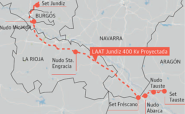 La promotora de esta iniciativa es Forestalia Renovables. En La Rioja las torres y cableado afectarían al territorio comprendido entre Alfaro y Briñas, con 250 apoyos (torres con alturas de 45 a 70 metros) paralelas al Ebro. Esto supone que atravesará localidades vitivinícolas, también la zona de Labastida (Álava). Asimismo, discurrirá de forma paralela, en gran parte del trazado, a otra existente de alta capacidad (ambas de 400 Kv) perteneciente a Red Eléctrica de España.