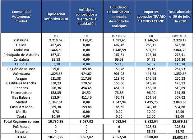 En el caso riojano, 57,52 millones corresponden al primer tramo del fondo COVID y otros 53,18 millones se ingresan en concepto de liquidación del 2018, descontados los anticipos, que en el caso riojano fueron cero.