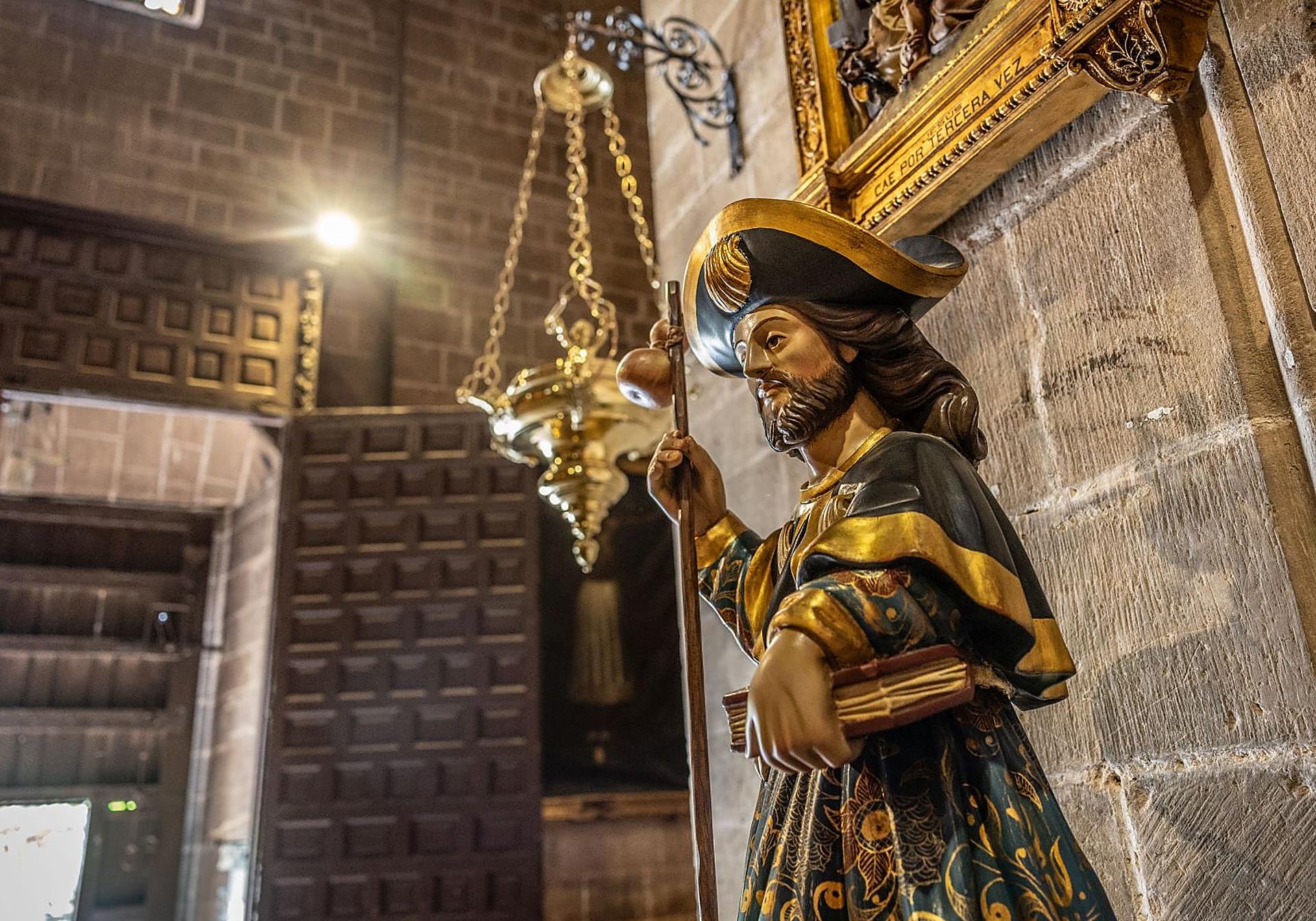 En Navarrete no realizaron ni obra, aprovecharon los agujeros de las bóvedas para pasar las cuerdas y crear la tensión. En Santiago ocho personas ejercen de 'tiraboleiros', mientras que en Navarrete solo son tres: David Castroviejo, Félix Prieto y Francisco Infante. Sucedió, incluso, que las obras de la catedral gallega en 2019 otorgaron al de Navarrete la pasajera condición de ser el único incensario volador de la Ruta Jacobea española. «A muchos les sorprende. Alguno que lo ve colgado pregunta si va a volar ese día. Normalmente damos una estampa con la imagen de Santiago peregrino como recuerdo», expone el párroco.