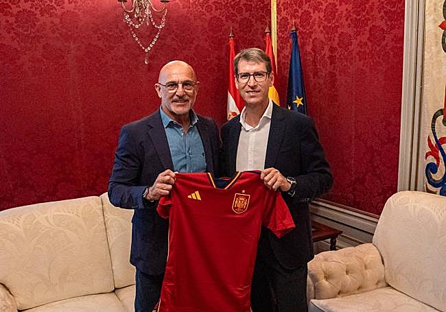 El presidente del Gobierno de La Rioja, Gonzalo Capellán, junto al director general de Deporte y Juventud, Diego Azcona, ha recibido este sábado en el Palacio del Gobierno al seleccionador nacional de fútbol, Luis de la Fuente, que se ha proclamado recientemente campeón de Europa.