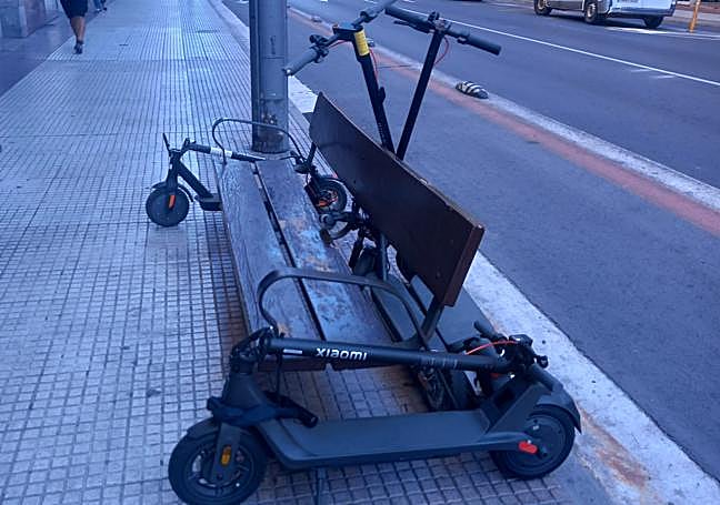 Un vecino de Logroño nos remite esta fotografía, de la calle Murrieta, a la altura del número 50, para ilustrar cómo en la ciudad se utiliza el mobiliario urbano para aparcar patinetes eléctricos. Ya sea por falta de consideración o aparcamientos, esta práctica genera que «las personas mayores debemos desplazarnos a otro lugar poder sentarnos», razona.