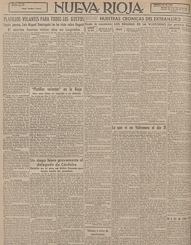 Recogía Diario LA RIOJA en marzo de 1950 tres avisistamientos diferentes: en la capital «una muy respetable familia advirtió desde la galería de su domicilio a eso de las cuatro y media de la tarde del martes un inusitado resplandor a bastante algura, viendo que procedía de un objeto sumamente brillante que durante unos segundos cruzó el espacio en dirección Norte-Sur perdiéndose de vista ente las nubes cuando se hallaba, al parecer sobre la jurisdicción de Villamediana».