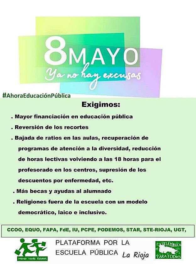 La Plataforma por la Escuela Pública de La Rioja ha apelado hoy a la sociedad riojana a concentrarse mañana, día 8, para exigir una mayor financiación en la educación pública, «una reversión» de los recortes, una bajada generalizada de ratios, un aumento de becas y ayudas al alumnado.