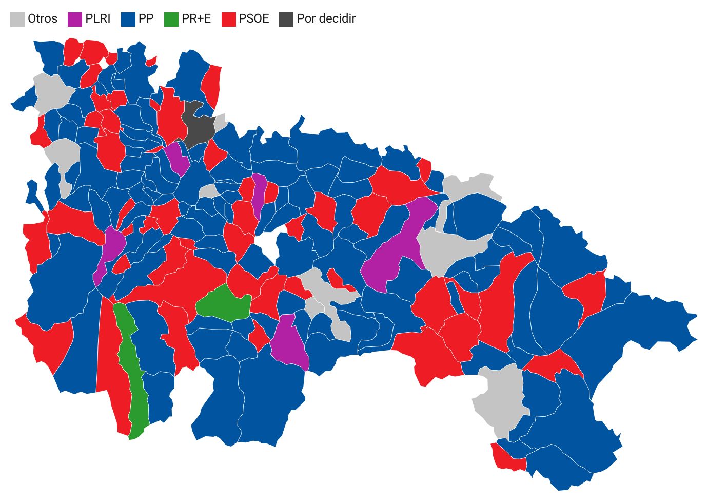 El vuelco se produce no tanto en el reparto del número de ayuntamientos entre las dos principales fuerzas políticas, sino en el tamaño de los mismos. En este sentido, el PP ya obtuvo hace cuatro años 103 alcaldías, casi el doble de las que tenía el PSOE (54), pero entonces este último era el partido claramente dominante. Ahora, los populares suman seis ayuntamientos más, mientras que los socialistas pierden ocho, a la espera de lo que suceda en San Asensio, donde el recurso presentado por los socialistas ante la Junta Electoral Central obligó a aplazar hasta el 7 de julio la elección de alcalde.