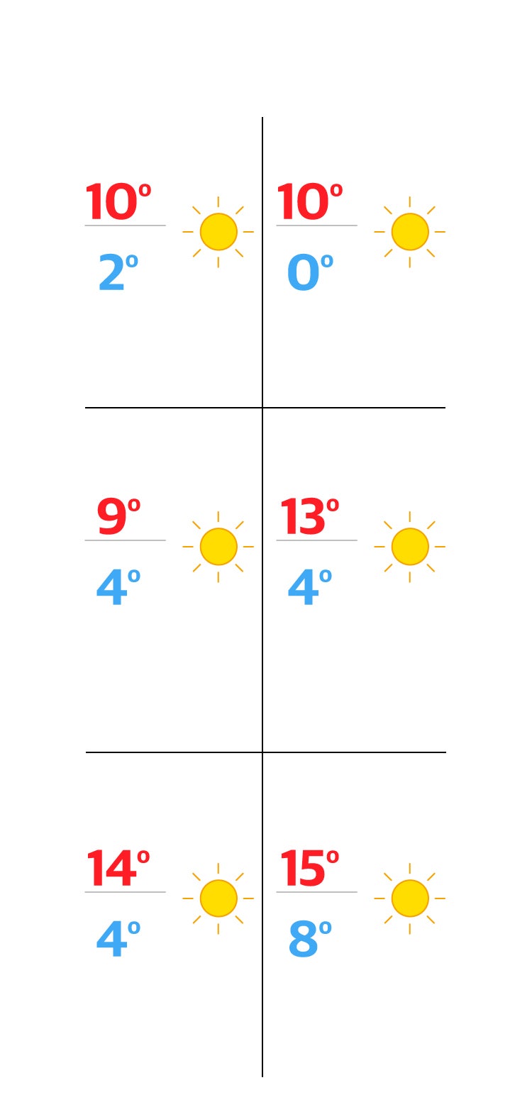 Este martes, con el techo en 10 grados en Haro y Logroño, las mínimas caerán a 1 y 2, respectivamente (en Calahorra oscilarán entre 4 y 12). Los termómetros proseguirán su desescalada hasta arrancar de cero al día siguiente para iniciar una escalada en la segunda parte del puente que llevará el mercurio a rozar, a final de semana. los 15 grados, con madrugadas suaves de entre 4 y 8. Más afortunados aún serán los riojanos que opten por trasladarse a algunos de los destinos habituales, como Laredo (con entre 9 y 19 grados a partir del jueves y entre 15 y 23 el domingo) o Salou (6 / 17 este miércoles, 8 / 16 el jueves, 12 / 17 el viernes, 10 / 18 el sábado y 11 / 22 el domingo).