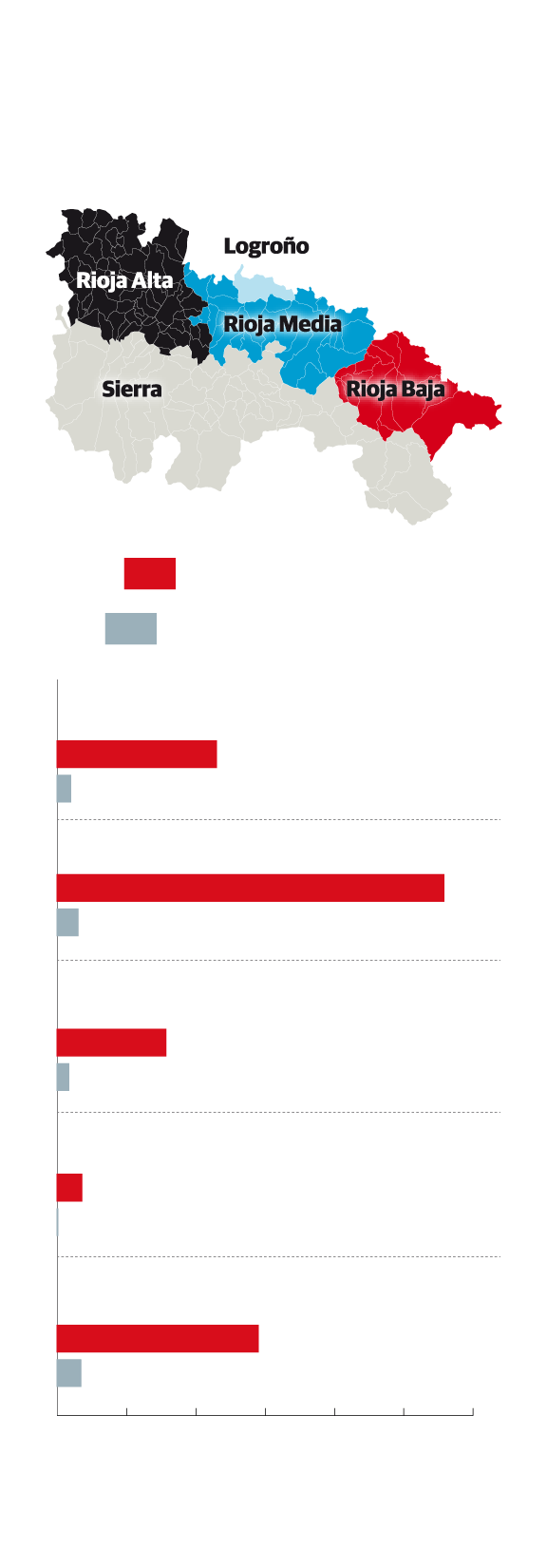 «Creo que sobre todo se debe al espíritu emprendedor. En La Rioja Baja sigue habiéndolo y en la Alta se ha ido perdiendo», resume el decano del Colegio de Economistas, Ernesto Gómez Tarragona. Los problemas que atraviesa el mercado del vino han afectado con especial virulencia a las comarcas riojalteñas: «Influye mucho, eso es evidente. Si en una zona hay un cultivo intensivo en algo, en este caso vino, y ese algo de pronto se cae, todo eso arrastra la economía. Y si el día de la mañana vuelve a ir para arriba, la economía subirá como la espuma».