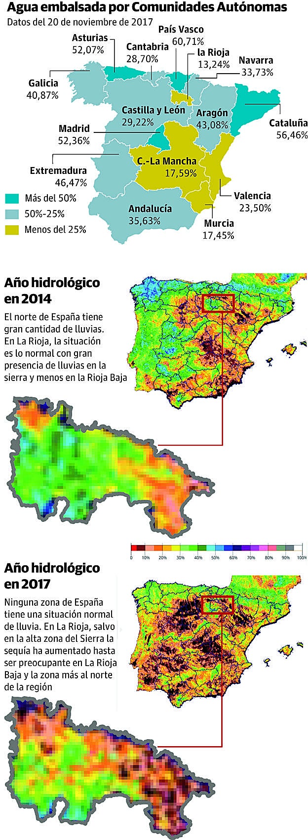 Aunque estadísticamente este 2017 no es de los peores -a día de hoy se registran 340,8 litros por metro cuadrado frente a los 367 habituales-, lo cierto es que la mayor parte de la cosecha hídrica llegó en la época estival -59,9 litros por metro cuadrado en junio, 86,8 en julio y 34,3 en agosto-, meses en los que las lluvias son menos aprovechables que en el resto de las estaciones. Un invierno sin nevadas, una primavera sin las suficientes aportaciones -abril dejó solo 4,7 litros- y el actual otoño, donde los escasos días en que las nubes han cubierto el omnipresente cielo azul solo han dejado 29 litros en el último trimestre, han llevado a los embalses riojanos a una situación límite.
