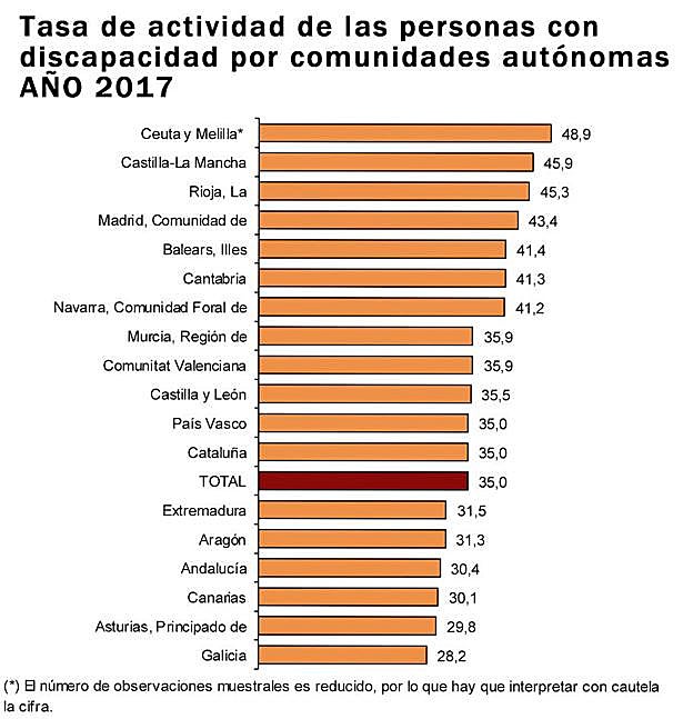 La participación laboral, según el INE, está determinada por el tipo e intensidad de la discapacidad: oscila entre el 57,7 % cuando es menor y disminuye hasta el 11,4 para un grado superior. Las mayores tasas de actividad las tienen las personas con deficiencias auditivas (58,1 %) y las menores, las que tienen discapacidad mental (31,1 %).