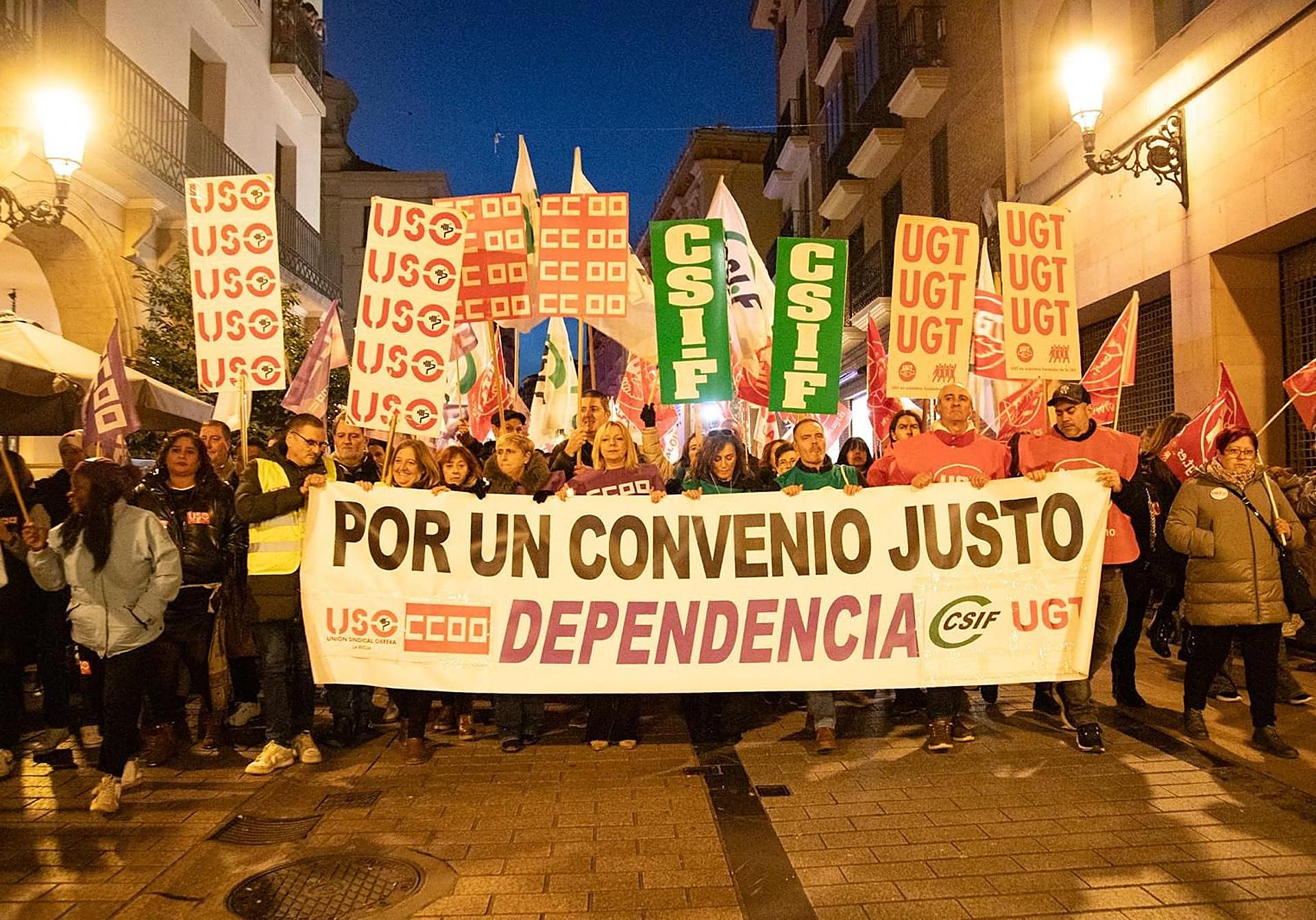 Los sindicatosCC OO, UGT, CSIF y USO se han unido en la tarde de este sábado en una manifestación en Logroño para exigir «un convenio justo de residencias y centros de día ... ». Los principales puntos que reclaman las organizaciones son una subida salarial de al menos el 25%, la reducción de la jornada laboral, el complemento de las bajas por contingencias profesionales y comunes, el cumplimiento riguroso de la prevención de riesgos, una oferta formativa y la conciliación. Alrededor de unas 300 personas se han reunido en la plaza de la Diversidad para recorrer toda la calle Portales, con un ataúd ficticio abriendo la protesta, en la que también ha habido una batucada.