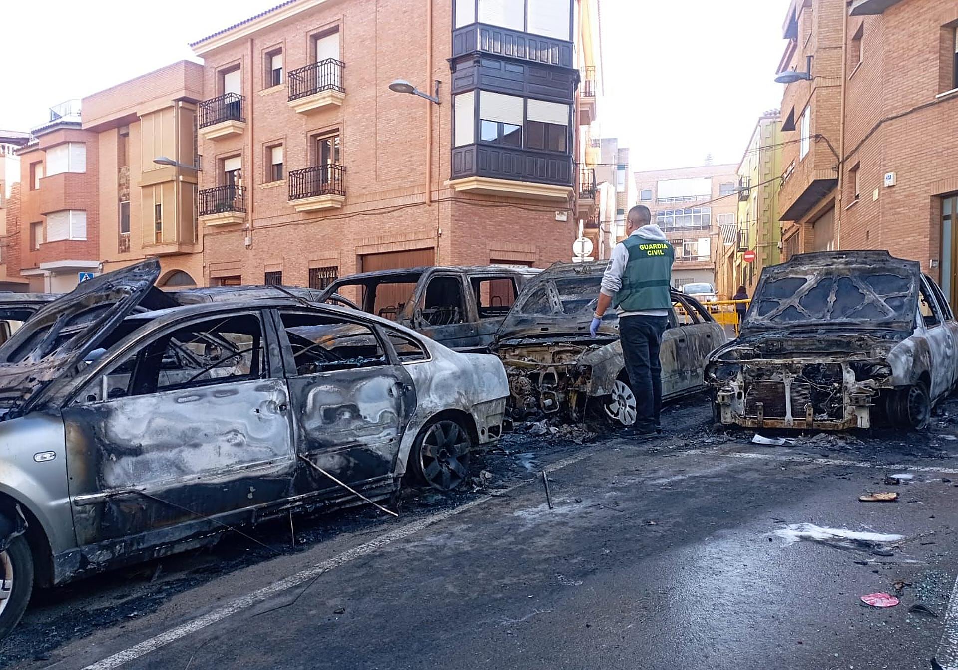 Quienes este miércoles por la mañana se acercaban a la plaza del Planillo de Alfaro encontraban una escena que parecía sacada de las malas noticias que nos caen últimamente, una imagen de un escenario de guerra o de desastres naturales. Diez vehículos estaban tras un perímetro acordonado por la Policía Local. Seis de ellos calcinados. Dos con la huella negra a lo largo de buena parte de su carrocería. Y otros tres menos afectados. Fueron las víctimas del incendio que, surgido en el motor de un vehículo, tal y como informó en una nota de prensa SOS RIOJA, se propagó en la noche del martes al miércoles en el aparcamiento público al aire libre de esta zona histórica de la ciudad de las cigüeñas.