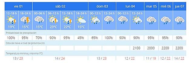 La Agencia Estatal de Meteorología informaba desde primera hora que la Comunidad Autónoma de La Rioja se encuentra en nivel amarillo tanto por lluvias como por tormentas, un aviso que se prolongará hasta el domingo con una probabilidad de entre un 40% y un 70%. Si bien toda La Rioja puede verse afectada por las tormentas, el área donde se espera una mayor concentración será la Ibérica.
