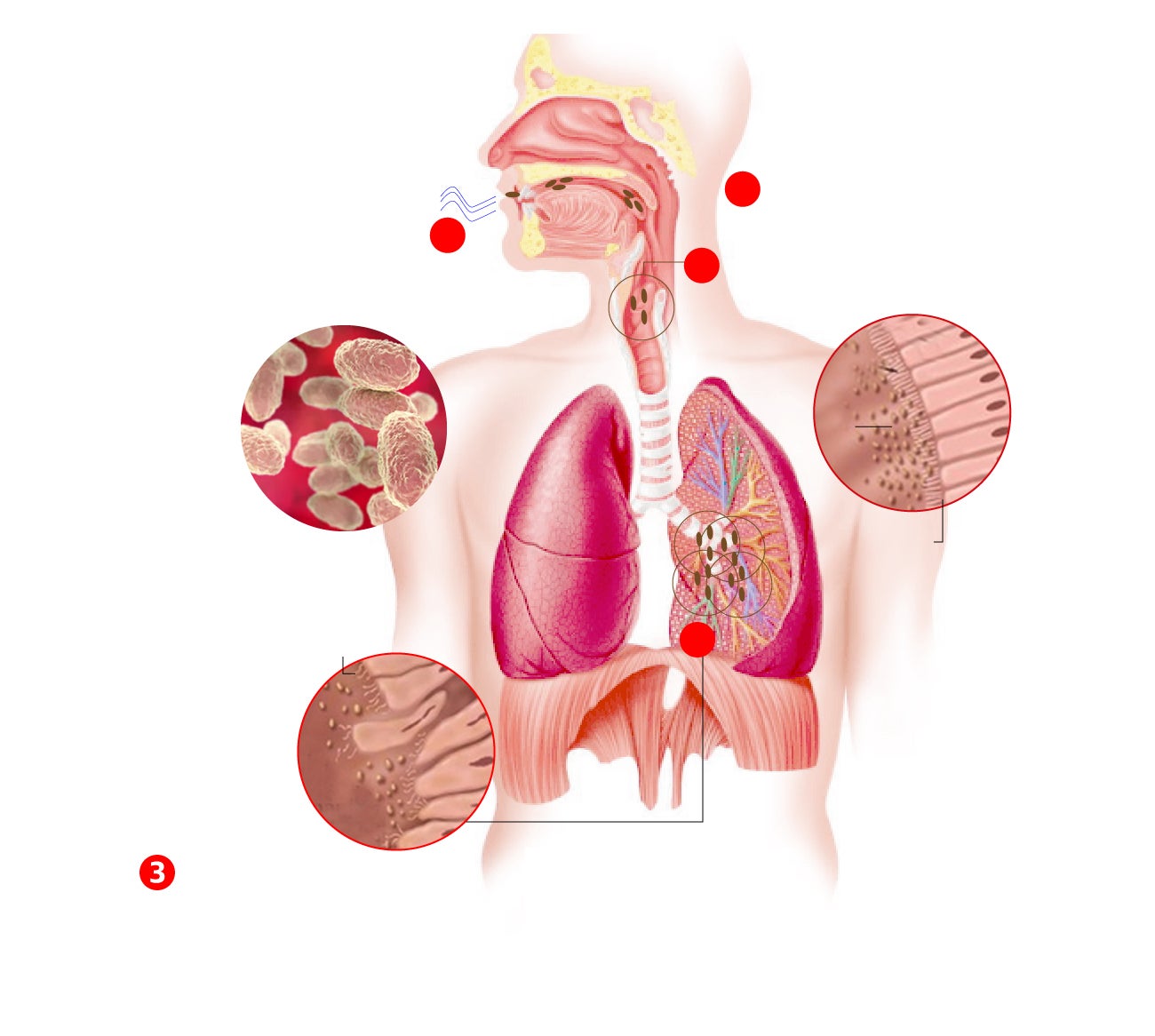 Paraliza la mucosa de la garganta y se expande por la tráquea y pulmones