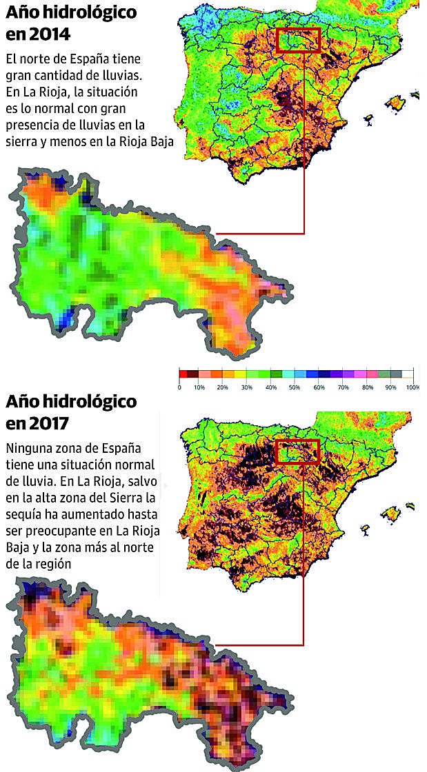 Más allá de los datos objetivos y medibles, como los registros de precipitaciones y el aumento de las temperaturas máximas, medias y mínimas, los rigores de la sequía se aprecian en la faz riojana tal como se demostraba en dos imágenes de un mapa de España hechas públicas la semana pasada por la Agencia Estatal de Meteorología .