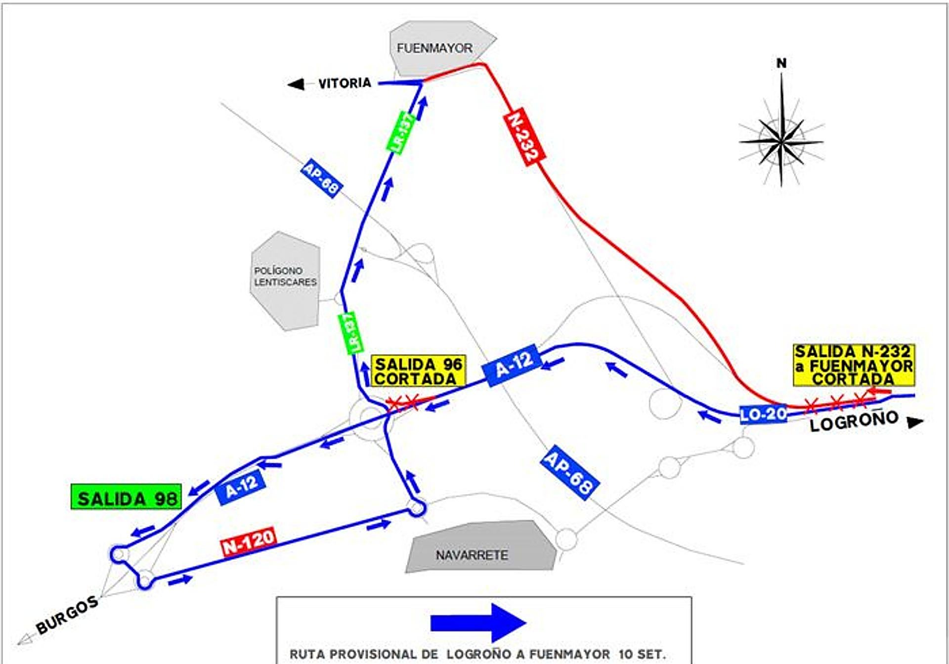Para asegurar la fluidez del tráfico durante estas afectaciones el Ministerio ha anunciado que se habilitarán dos itinerarios alternativos: circular por la A-12 hasta la salida 98 (Sotés y Hornos de Moncalvillo) para regresar por la N-120 y conectar con la LR-137 en Navarrete hasta la N-232 en Fuenmayor. «Una vez finalizados los trabajos de extendido de capas previas de firme y colocación de señalización, se procederá al extendido de la capa derodadura del firme de la calzada en sentido Burgos. Para la ejecución de estos trabajos y para garantizar la seguridad de los trabajadores y usuarios, se producirán las afectaciones al tráfico», ha informado la Delegación del Gobierno de La Rioja.