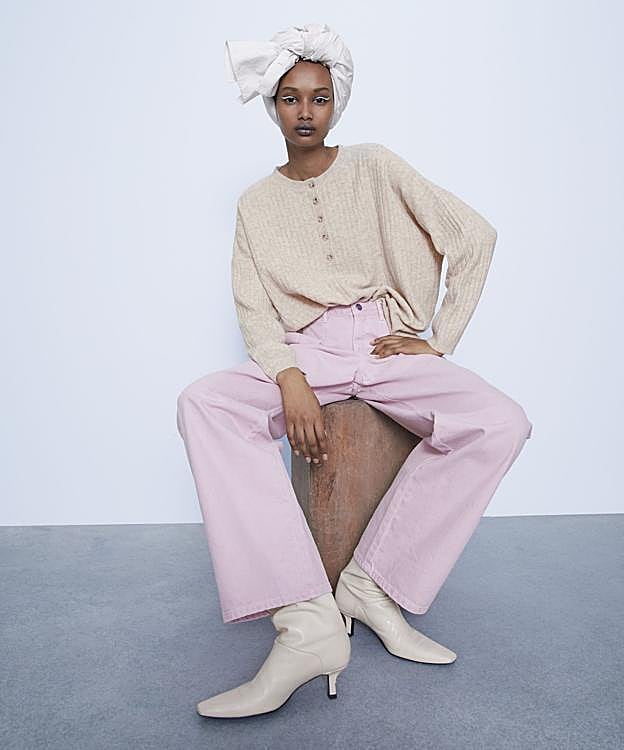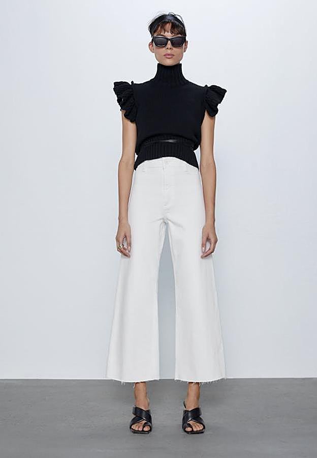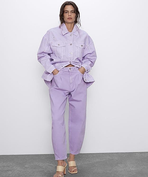 Jeans de tiro alto con bolsillos de plastrón en la espalda. Bajo con acabado deshilachado. Cierre frontal con cremallera metálica y botón. Estas prendas, según explica Zara en su web, «han sido producidas utilizando tecnologías que reducen el consumo de agua en los procesos de tintado».