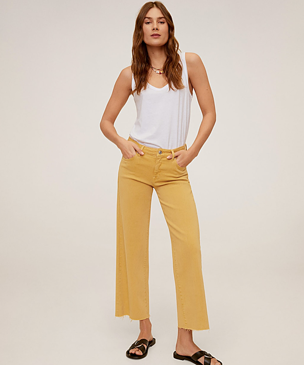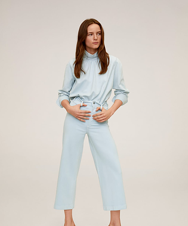 Los 'wide leg jeans' son pantalones anchos, como los palazzo. pero en tejido vaquero, y este de Mango es el clásico denim sin tejido elástico para quienes buscan un estilo atemporal. Diseño recto, crop de tiro alto y fabricado en tejido de algodón sostenible. Tiene dos bolsillos laterales, otro 'portamonedas' y otros dos de parche en la parte posterior. Cierre con cremallera y botón.