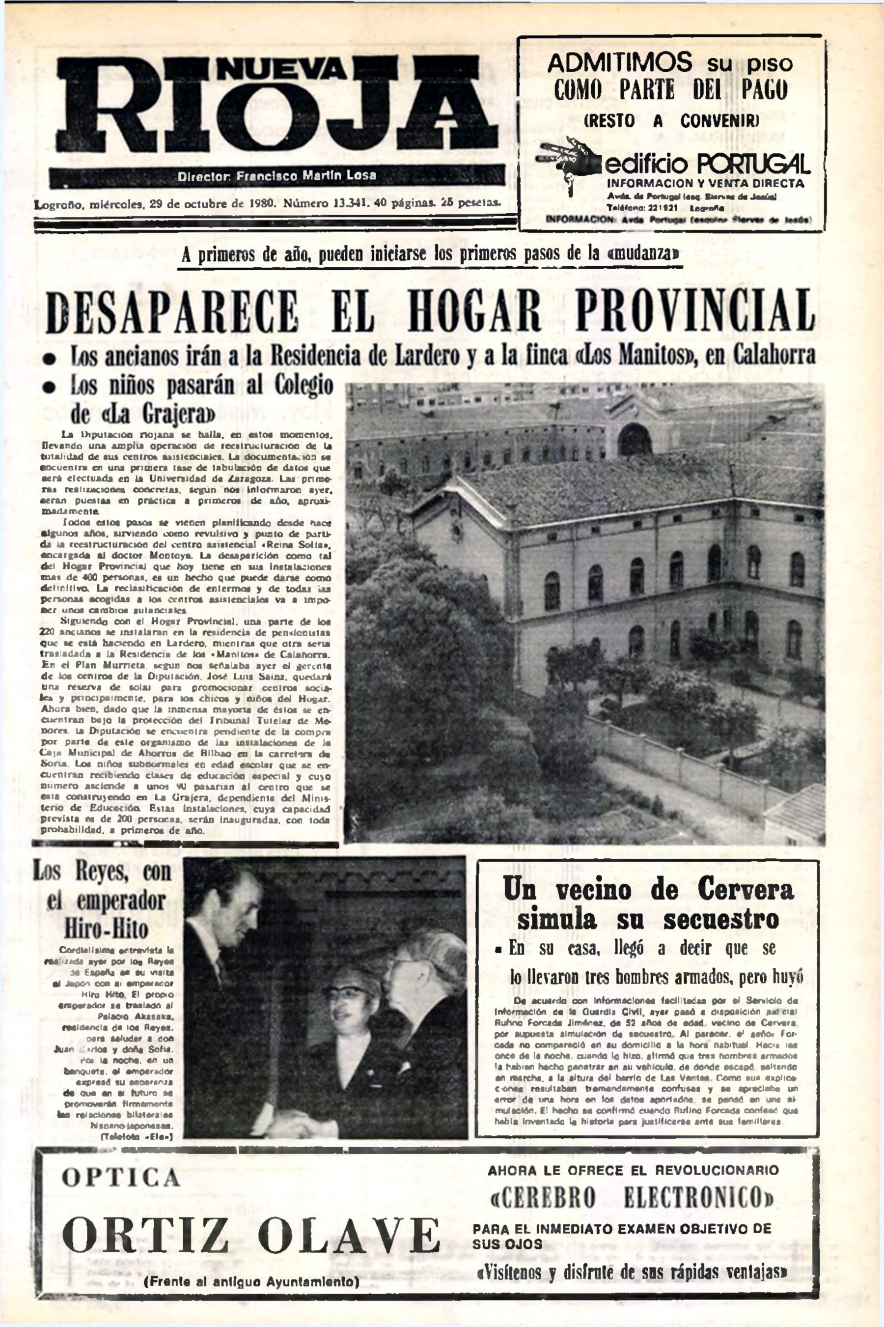 El tiempo fue mudando sus funciones hasta llegar, poco antes de cumplir su centenario, al final de su historia. Anunciaba el periódico el inminente cierre del Hogar Provincial, que albergaba a más de cuatrocientas personas. Los mayores serían destinados al centro Reina Sofía de Lardero y los Manitos de Calahorra, mientras que los menos, al nuevo colegio que se estaba levantando junto a La Grajera, el que hoy es el Marqués de Vallejo.