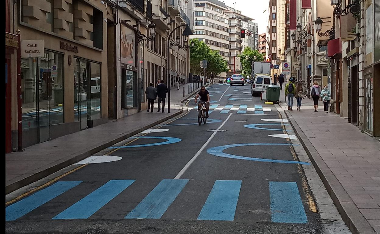 Los nuevos dibujos en la calle Sagasta piden al conductor que pase a un máximo de 20 km/h y «tapan el asfalto para invitar a los peatones a usarlo», argumenta el concejal de Desarrollo Urbano