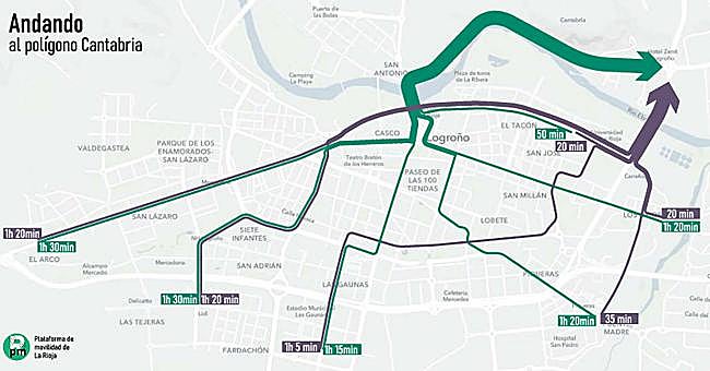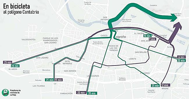 La Plataforma de la Movilidad de La Rioja ha calculado los tiempos de los desplazamientos andando o en bici al polígono Cantabria en función de si se utiliza la conexión ciclopeatonal de la avenida de Mendavia o la que se ha descartado junto a la A-13 partiendo desde las distintas zonas de la ciudad. La entidad considera que los barrios de la zona este se ven perjudicados al haberse echado atrás esta actuación que contaba ya con fondos europeos.